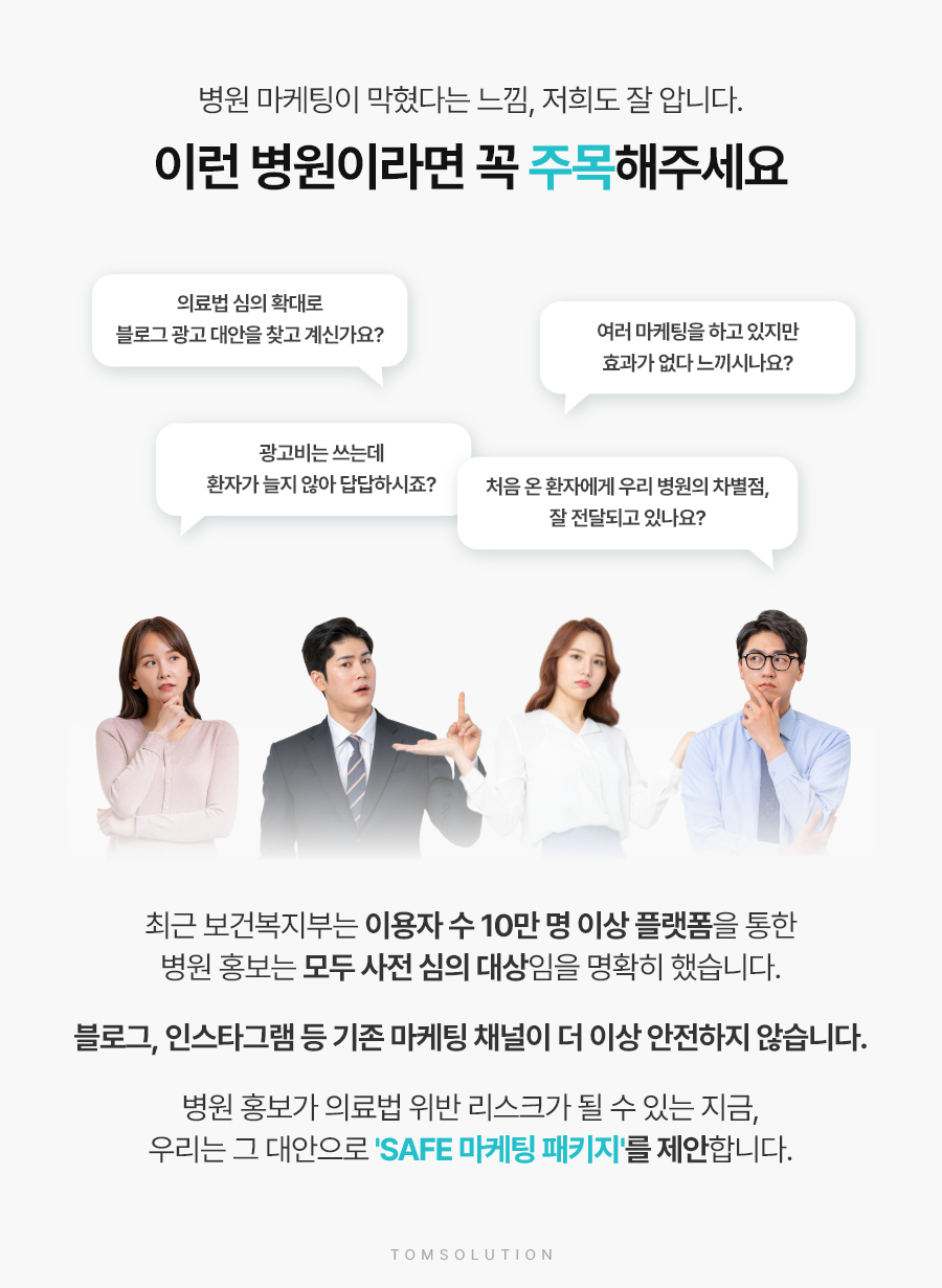 심의 대상이 되면서 많은 병원들이 혼란을 겪고 있습니다. 탐솔루션은 병원이 반드시 강조해야 할 메시지를 중심으로 콘텐츠를