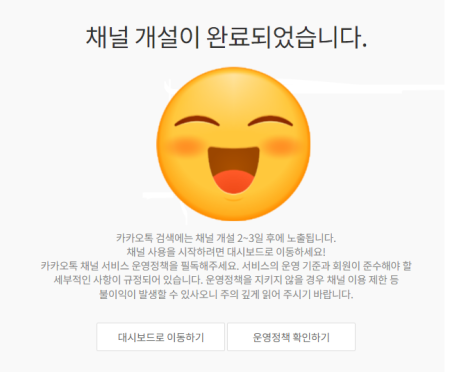 이때 채널 대시보드로 이동하시어 채널 설정들을 진행해주셔야 채널 공개, 검색 허용, 1:1 채팅이 가능해집니다.